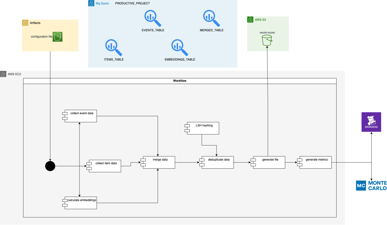 Deduplication: recommendation images that were too similar between each other had to be addressed by LSH hashing mechanism to group them and only retrieve one element from the group (preferrably the product that had best metric performance).